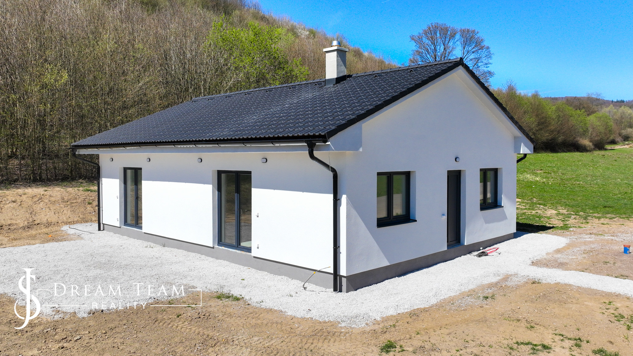 Novostavba jednopodlažného drevo-domu je pripravená na okamžité dokončenie podľa vlastných predstáv. Dokončenie do finálnej podoby „na kľúč“ vie zabezpečiť po konzultácii a dohode aj zhotoviteľ novostavby. Rodinný dom je odizolovaný, zateplený, strešná krytina škridla, okná plastové – dvoj sklo. Vykurovanie bungalovu je riešené elektrickým podlahovým kúrením s predprípravou na ovládanie v každej miestnosti samostatne. Voda je riešená 45m vrtom, rozvody privedené priamo do domu, vodárenský čerpací systém potrebné dokúpiť. Plynová prípojka priamo na pozemku, plyn do domu zavedený nie je. Odpad je riešený 12m3 žumpou.